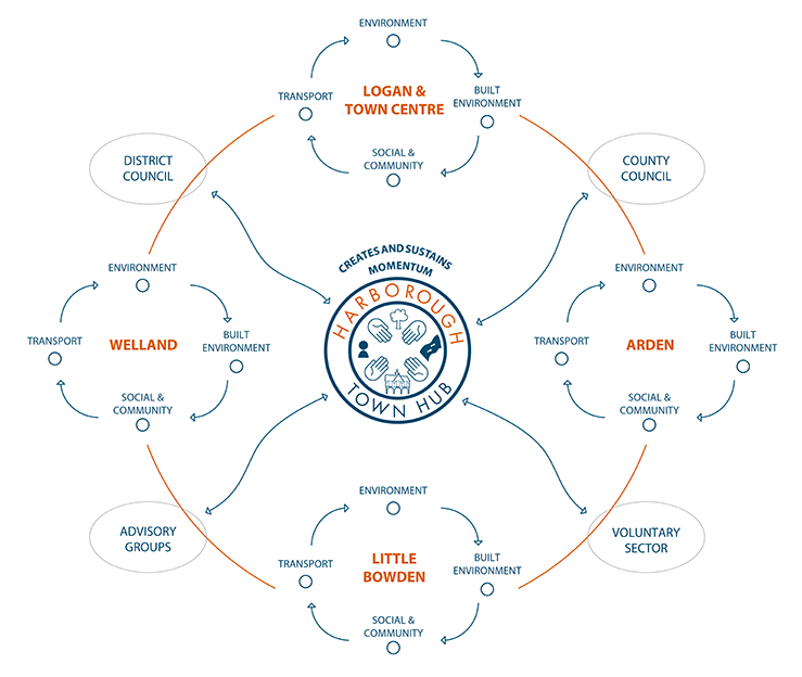 Harborough Town Hub (HTH) acts as a central hub, connecting the four forums with Leicestershire County Council and Harborough District Council, as well as with voluntary organisations and Advisory Groups. HTH includes members from all the forums, ensuring a united approach to making Market Harborough a great place to live, work, and visit.